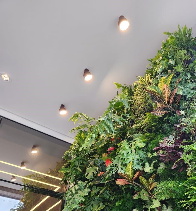 Isso significa que, no dia da montagem, não há manuseio de terra no local, e as plantas já chegam adultas e perfeitamente adaptadas ao sistema. Dessa forma, garantimos uma transformação imediata e uma excelente adaptação ao novo ambiente. Atualmente, trabalhamos com mais de 40 espécies diferentes, adequadas para todos os tipos de ambientes: sombra, meia-sombra, sol pleno – ou seja, qualquer espaço pode receber um jardim vertical.